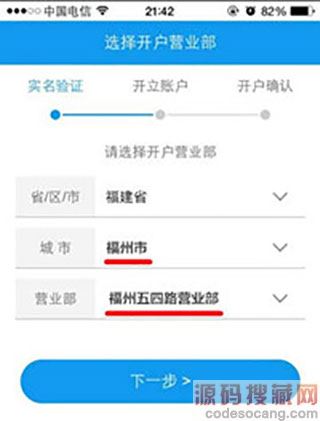3、选择开户营业部,如:福建省 -> 福州市 -> 福州五四路营业部。