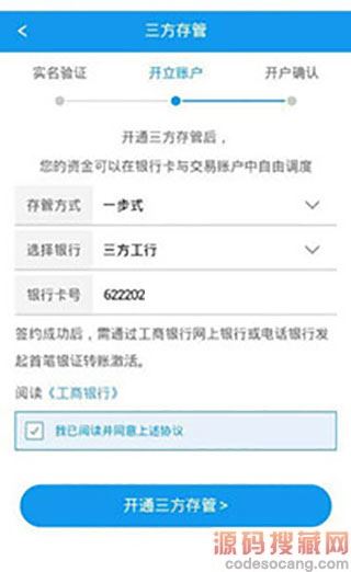 11、开通三方存管。存管方式:农行、光大、兴业、中信、民生、工行、招商、广发、平安选“一步式”(中行须输入电话银行密码,没开通电话银行的慎用);