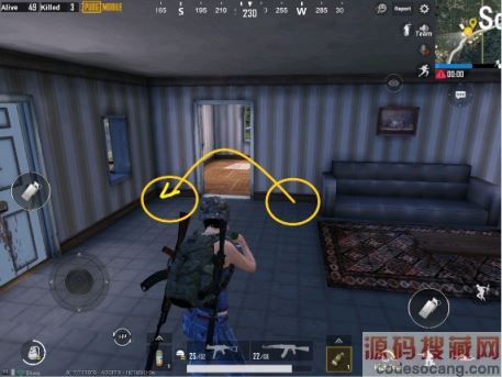 如果对面没动作,直接走到右边的门口,小跳到左边门口,击杀小房间的敌人。