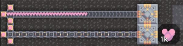 不过连续两个是可以的。有的版本利用(反向)分类器和溢流门的运输速度极快,以2+1的方式串联,达到(几乎)瞬时运输效果。如下图三个物品源180/s的速度,6s就能填满仓库。