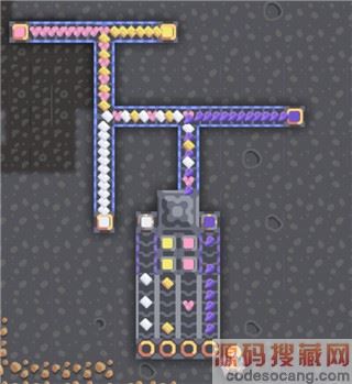 这个也是放松了对材料的要求,没有追求满效率,让蓝图更好看。我觉得比较精妙的地方是那两个沙的分类器。原本没有上方的抽水机,沙子是直接运下去的,一个分类器直接承担了沙子,硅,煤三种材料的分配。加了抽水机之后也能负责把煤往下运,硅往左右运。