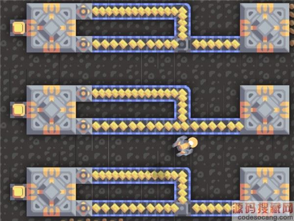 注意B不接受带输入,A也不接受桥下的带输入,所以在输出资源时,往往需要多安置一个传送桥单体,让最外面(上图为最上面的一排钻头,共四个)的钻头也能正常输出。