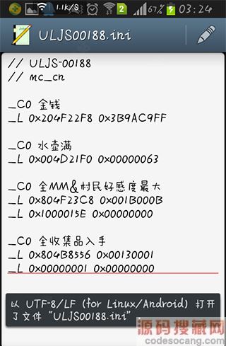 5、从网上找到你想使用金手指代码,然后通过文本编辑器把代码粘贴到里面,然后保存。