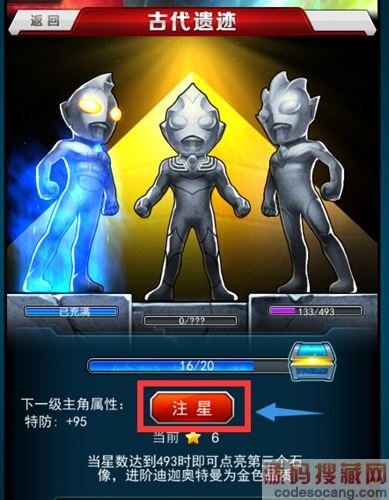 3、玩家可以通过点击【注星】来给石像充能,每次注满星槽,作为人间体之一的玩家自己的属性也会成长。当一个石像获得的总星数满时,石像被激活。此时会解锁迪迦的新形态。值得一提的是,每当星数充满一次能量条,都可开启一个宝箱奖励。
