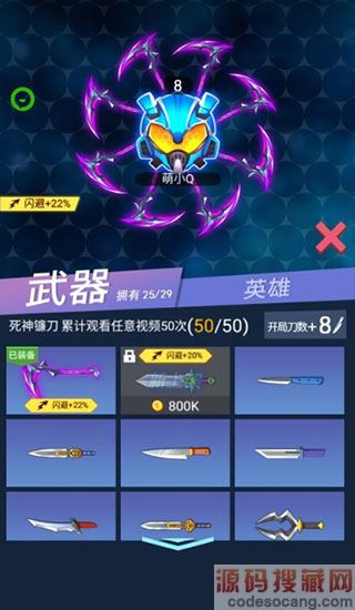 2、向右滑动屏幕还可以看到武器与英雄两个选项,在这里可以为自己的飞刀装扮不同的武器和英雄皮肤,武器和英雄当然是等级越高越好。