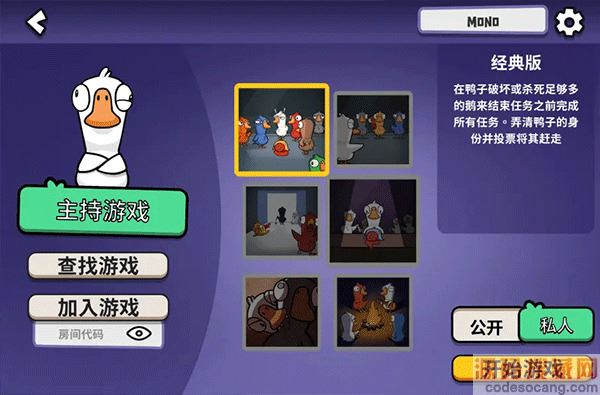 4、注册并登录成功后,点击开始游戏来创建房间。共有6种游戏模式,左边的主持游戏代表创建自己的房间,可以改为公开或者私人,私人房间只有好友和受到邀请的人可以加入,公开的话就以为这可以在查找游戏中搜索到你创建的房间。