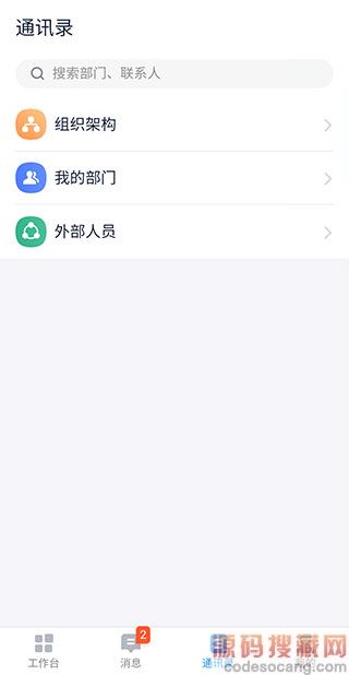 4、【通讯录】页面会显示用户的组织架构等内容。