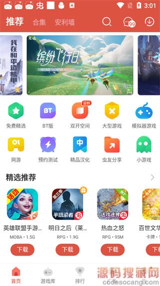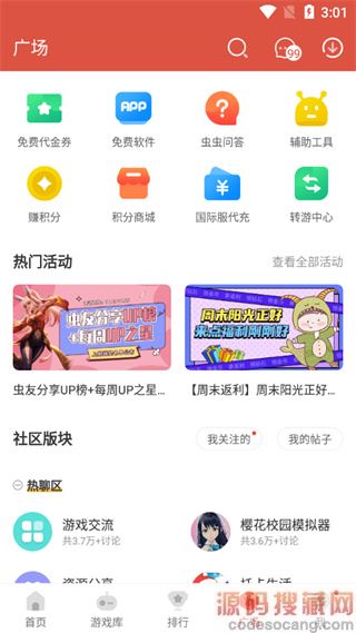 1、下载虫虫助手app正版后并运行软件,可以看到有首页、游戏库、排行、广场、我的五个板块;