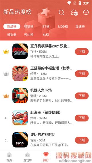 4、点开排行,有新品榜、畅销榜、BT榜、MOD榜、预约榜等多种游戏排行榜供玩家选择;