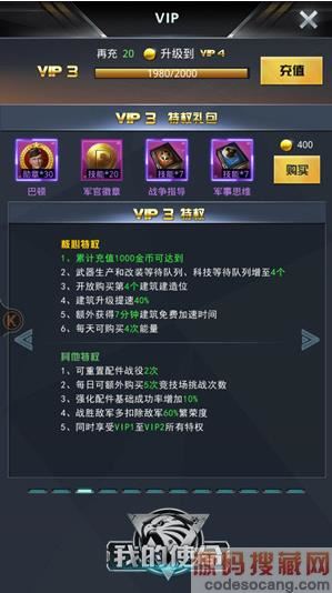 2.V3主要是可以4支部队和4个建筑造位,建筑速度高40%,能省很多时间!主线开放建筑后,在前期 指挥中心、各种造车造飞机场不能停(但这里是建议专门玩一种流派,新手建议坦克流,原因坦克消耗材料较少,能大量生产,而且比较耐扛),如果基地的资源跟得上可以优先升研究所、仓库、内矿