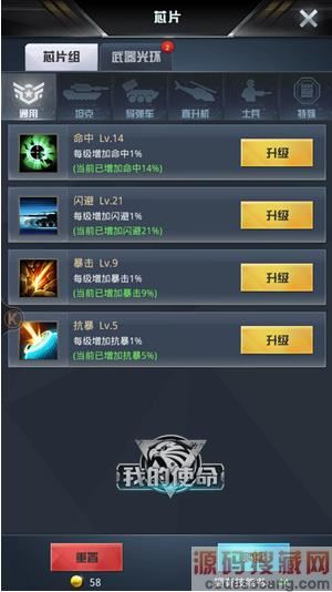 5.芯片通用技能主要点闪避。(因为前期一般都是用绿蓝车,闪避好处是少损一些,累积到中期就比其他玩家强!)导弹攻击、坦克生命、坦克攻击也是优先考虑点的技能,其他前期一概不点,中期再点暴击、闪避和你玩的兵所属技能