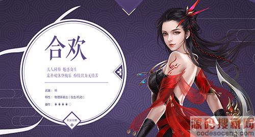职业特点:神秘莫测的合欢,紫袂翩然,魅惑众生。合欢属物理系输出,单体强力输出,同时也有魅惑敌人的控制技能。合欢出手讲究“稳准狠”,功法大多迅速快捷,诡异多端,一旦出手,绝不留情,擅长在无形之中取人性命。