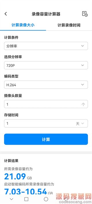 在录像容量计算器里选择分辨率,填写摄像头数量和存储时间后即可计算出录像大小。