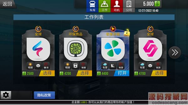 3、选择自己想要接受的工作就可以进入驾驶了,每一种工作的金额奖励都不相同,驾驶任务也各有特色,每一任务下方不仅会显示当前的奖励金额,同时还会显示运输时的天气状况以及预计耗时。