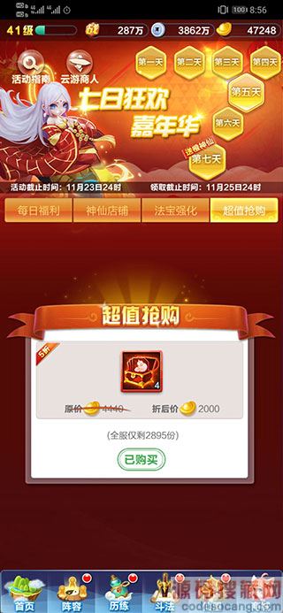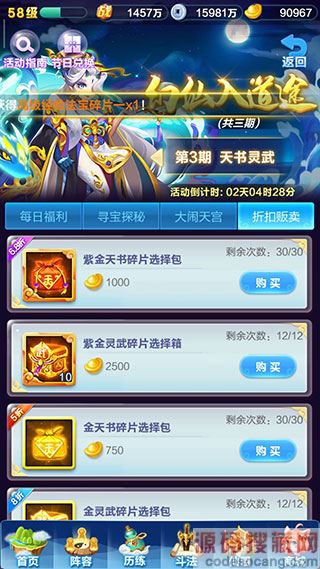 10、第四天是突破任务,抢购是突破丹,这里必须购买。折扣很低,实用价值奇大,没有那一千突破丹活动期限内至少少拿450个突破丹。这里有个小技巧,就是首先把一个神仙突破到第六重,然后重生掉,再突破到第三重,其他重生的突破丹平均分配给其他神仙。提示:获得的这些突破丹是完成不了所有神仙突破到四这个任务的,所以看见低折扣的突破丹还是要适当买一点点的,运气好一点大概买300多个,运气不好大概是400多个,小编亲身验证过的数量。