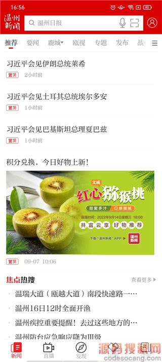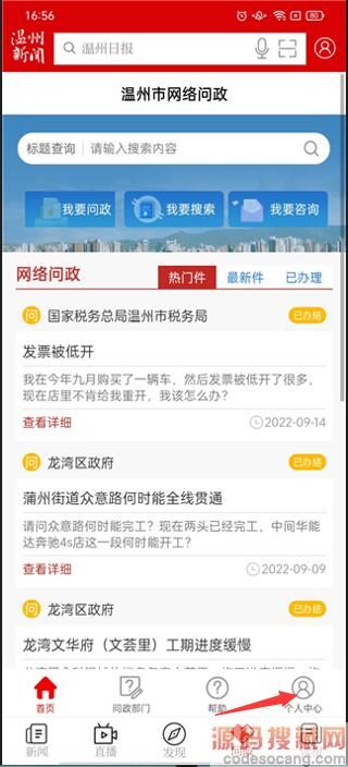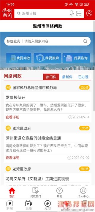 1、下载安装好温州新闻app,进入首页我们可以看见新闻、直播、发现、问政、读报5大模块;