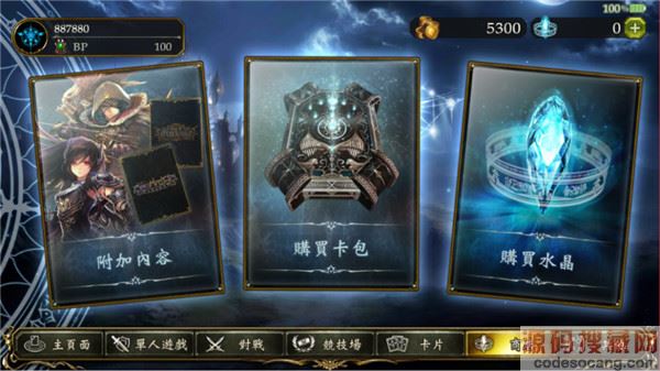 六、商店:附加内容、购买卡包、购买水晶。附加内容大致为购买不同类别的卡背以及主站者造型的选项,需要消耗金币以及相对应的钻石进行消费,同时有部分活动卡背可免费购买