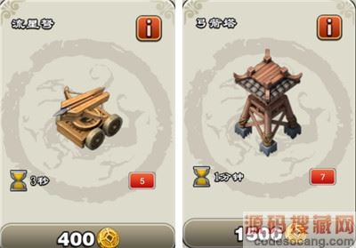 13、诸葛神弩:由诸葛连弩改造而成,射程、射速与攻击力都有了极大的提高,在补给充足的情况下,它可以瞬间摧毁任何目标