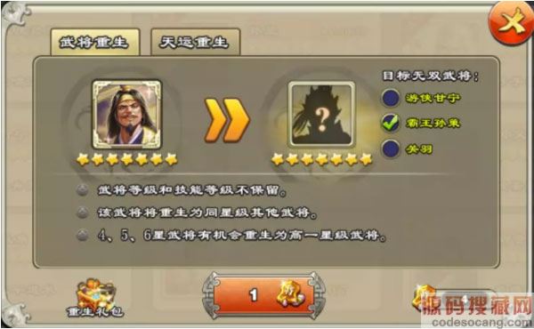 2、普通重生消耗重生令,4-6星的武将有机会重生为高一星级的武将。