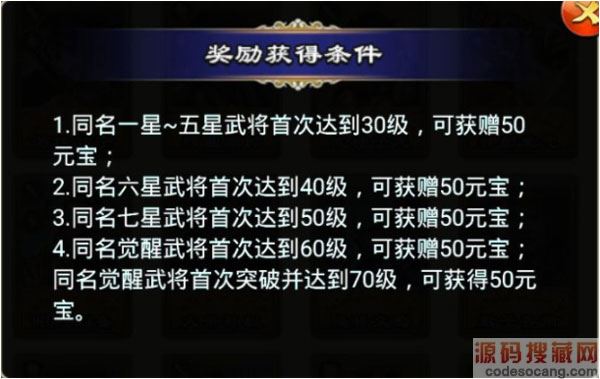 4、获得的新武将(同名武将只计第一次)首次升到满级能获得50元宝并开启天命,千万不要错过哦~