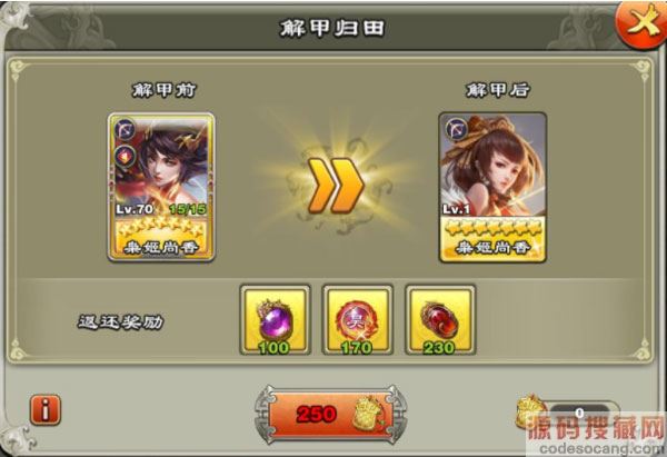 1、如对已觉醒和突破的武将不满意,可进行解甲,重置为初始状态,等级和技能均重置为初始值。