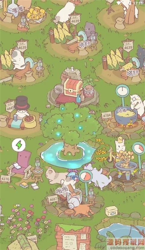 1、进入这款游戏之后,大家就能够看到大量的猫咪出现在你的眼前,虽然这些是猫咪,但其实都是做着人类的事情,在一片美丽的地塘边活动,有着自己的小屋子,需要玩家来帮助建设。