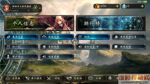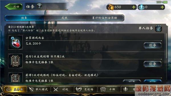 页面下方是游戏中全部界面的菜单选项,有单人模式、对战、竞技场、卡牌、商店和其他,页面右侧菜单为公告、邮箱、任务、好友以及直播。