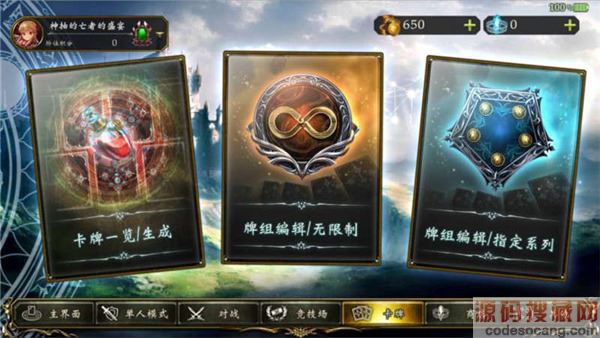 分为牌组编辑与卡牌一览/生成。牌组编辑可以对自己的全部卡牌进行编组处理,每组40张,有指定系列和无限制两种类型。卡牌一览/生成,则是对全部卡牌的浏览以及卡牌的制作。