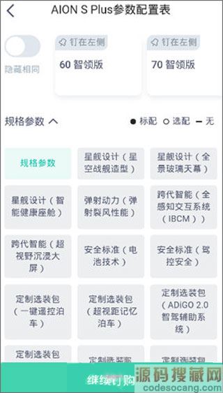 3、点击【选配】,选择要参看的参数,点击【继续订购】。