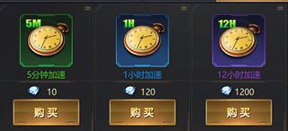分为5分钟加速、1小时加速和12小时加速,可适用于建筑加速和造兵加速,不能用于科技加速。