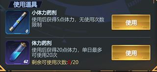 体力药剂:使用后获得20点体力,一天最多使用20个。
