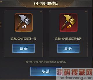 商用建造队:增加一条建筑队列(最多只能有两个队列),分为一天和七天,购买天数不同消耗的钻石也不同。