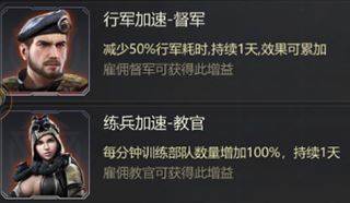 教官:练兵加速,可以使相同时间内招募兵的数量直接加倍,相应消耗的粮食数量也加倍。