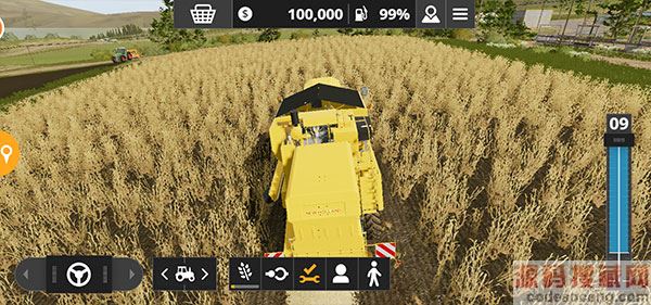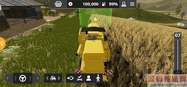 3、这是游戏初期您拥有的田地之一,田里的小麦已经成熟,是时候收割了,使用联合收割机即可收割田里的作物,右侧滑动条是油门,控制前进后退,左侧的方向盘控制左右转弯。