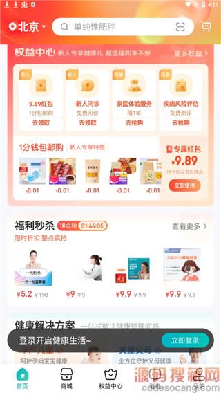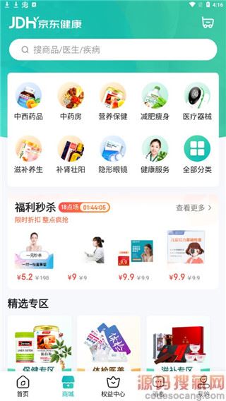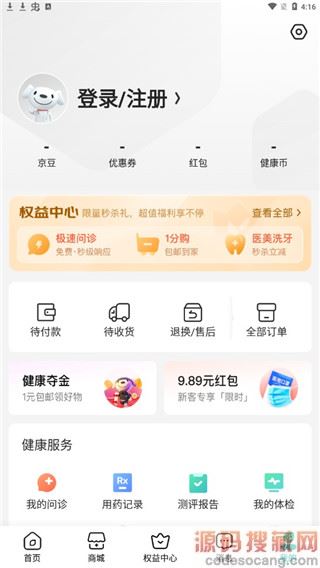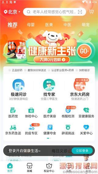 3、进入首页这里有很多功能,包含极速问诊、找专家、京东大药房、医药馆、体检中心、医疗美容、核酸检测、亚健康服务、京东药急送等等;
