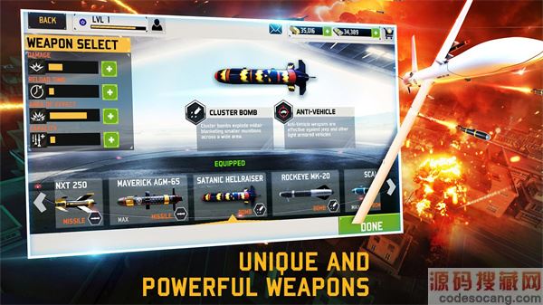 游戏每完成一个任务都会得到现金和金块的奖励,这些在飞机库设备升级中具有非常重要的作用,玩家不但能更换更加高端的无人战机,更能对枪械和炮弹进行升级,使它们发挥出更大的威力。战机不同的性能也是可以改善和提高的,它们会进一步提升战机的能力,在任务的执行中发挥出巨大的作用。