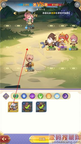 1、进入游戏选择战斗,点击下方的角色让他上阵,再根据角色的特性安排站位,角色攻击或者受到攻击都会积累怒气,怒气值满了就可以释放技能。