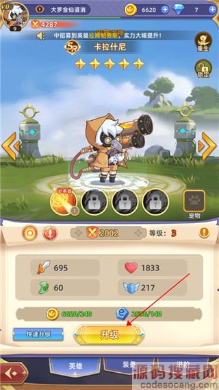 3、在英雄页面中可以对卡牌进行升级和穿戴装备。