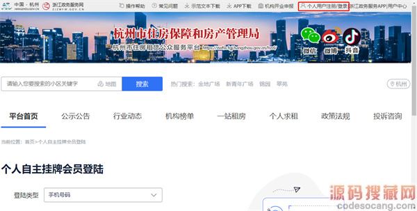 1、通过PC端网址https://zwfw.fgj.hangzhou.gov.cn/hzzl/或APP端注册、登录杭州市住房租赁监管服务平台,点击个人用户注册/登入。