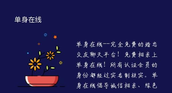 单身在线--完全免费的婚恋交友聊天平台!免费相亲上单身在线!所有认证会员的身份都经过实名制核实。单身在线倡导诚信相亲、绿色交友,24小时为单身朋友提供免费的实名制认证服务。