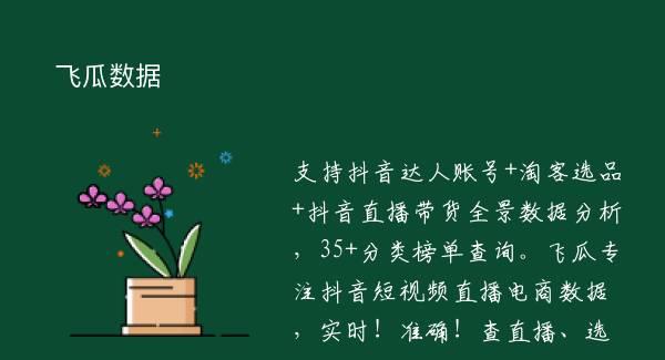 支持抖音达人账号+淘客选品+抖音直播带货全景数据分析,35+分类榜单查询。飞瓜专注抖音短视频直播电商数据,实时!准确!查直播、选商品、找达人,用飞瓜数据!利用数据分析为飞瓜数据