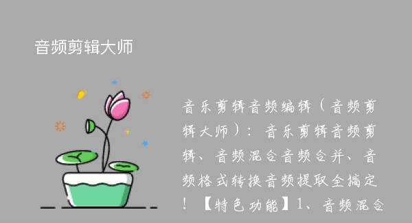音乐剪辑音频编辑(音频剪辑大师):音乐剪辑音频剪辑、音频混合音频合并、音频格式转换音频提取全搞定!【特色功能】1、音频混合:可将多种格式的音频音乐进行混合;2、音频合并:各类音