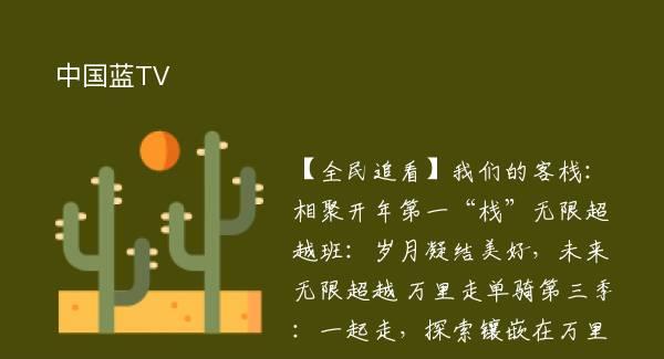 【全民追看】我们的客栈:相聚开年第一“栈”无限超越班:岁月凝结美好,未来无限超越 万里走单骑第三季:一起走,探索镶嵌在万里山河里的世遗宝藏奔跑吧?共同富裕篇:奔跑再出发好声音越