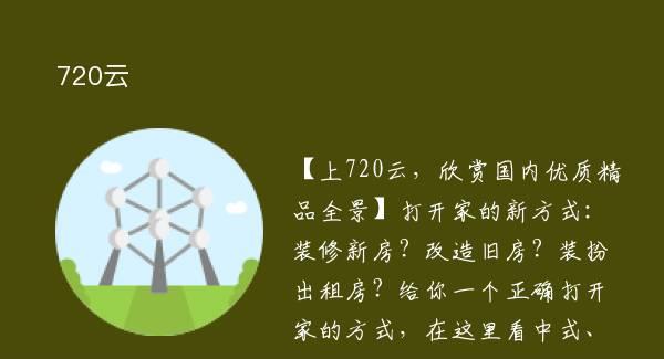 【上720云,欣赏国内优质精品全景】打开家的新方式:装修新房?改造旧房?装扮出租房?给你一个正确打开家的方式,在这里看中式、欧式、复式、loft以及各类户型房的全景设计图。给生