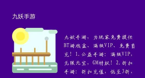 九妖手游,为玩家免费提供BT游戏盒、满级VIP、免费首充!1.公益手游:满级VIP,无限元宝,GM特权!2.折扣手游:折扣充值,低至3折,一秒到账!3.免费福利:免费首充、海量