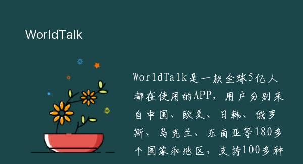 WorldTalk是一款全球5亿人都在使用的APP,用户分别来自中国、欧美、日韩、俄罗斯、乌克兰、东南亚等180多个国家和地区,支持100多种语言即时翻译,轻松与全球各地的人聊
