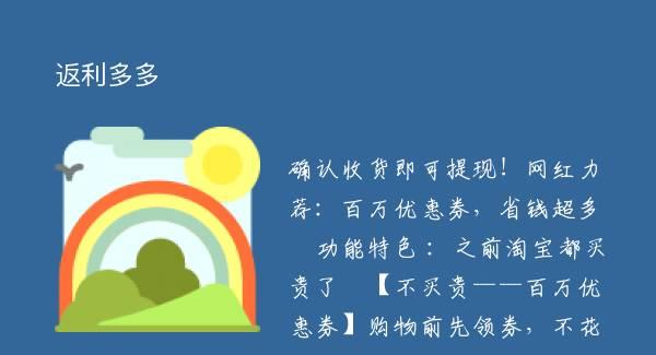 确认收货即可提现!网红力荐:百万优惠券,省钱超多█功能特色 :之前淘宝都买贵了█【不买贵——百万优惠券】购物前先领券,不花冤枉钱!网购节省至80%!女装、男装、鞋包、美妆、护肤