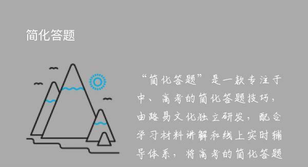 “简化答题”是一款专注于中、高考的简化答题技巧,由路易文化独立研发,配合学习材料讲解和线上实时辅导体系,将高考的简化答题技巧规律简单且实用的受用给学习者;让高考学生快速有效得分