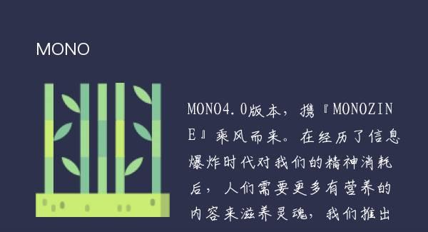 MONO4.0版本,携『MONOZINE』乘风而来。在经历了信息爆炸时代对我们的精神消耗后,人们需要更多有营养的内容来滋养灵魂,我们推出[MONOZINE],一种崭新的【新媒体