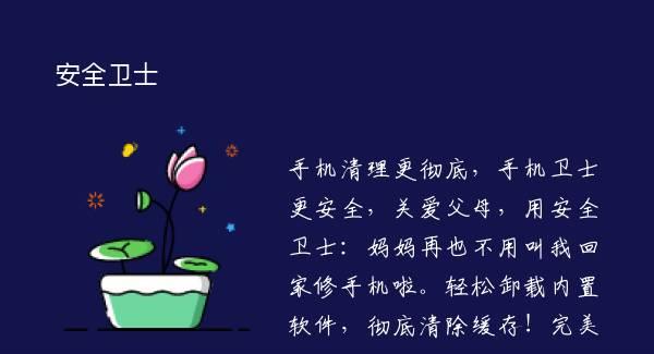 手机清理更彻底,手机卫士更安全,关爱父母,用安全卫士:妈妈再也不用叫我回家修手机啦。轻松卸载内置软件,彻底清除缓存!完美管理自启程序,加快开机速度!一键杀掉多余进程,释放运行内